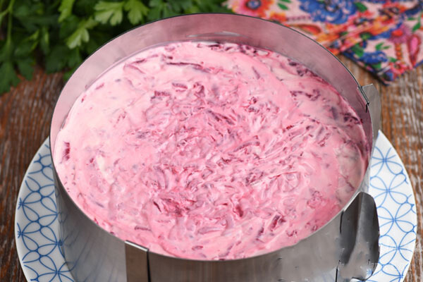 10. Paskutinis sluoksnis – burokėliai su majonezu. Salotas uždengiame plėvele ir dedame į šaldytuvą, kol želė visiškai sustings.