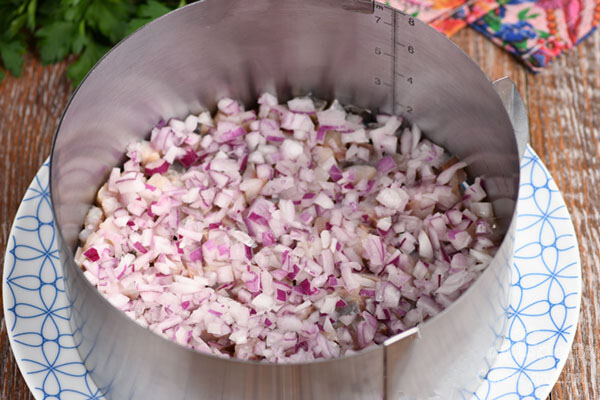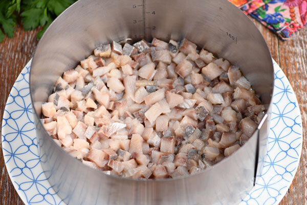 2. Salotas galima formuoti įvairiai: permatomoje salotinėje, be žiedo kauburėliu ant plokščios lėkštės arba su žiedu, kaip darau aš. Ant lėkštės pastatome žiedą (18 cm skersmens) ir sudedame paruoštą silkę.