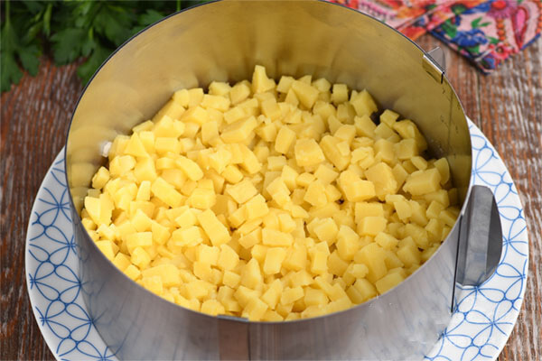 4. Man labiau patinka, kai bulvės ir kiaušiniai yra smulkiai supjaustyti. Smulkintomis bulvėmis padengiame svogūną ir aptepame majonezu.