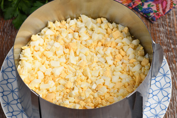5. Kiaušinius smulkiai supjaustome, dedame ant bulvių ir vėl patepame majonezu. Visus daržovių sluoksnius dar šiek tiek pasūdau.