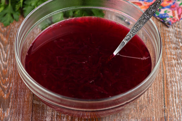 6. Kai želatina išbrinksta, salotų surinkimą trumpam pristabdome. Į dubenį sutarkuojame 1 mažą burokėlį (apie 150 g), užpilame karštu vandeniu (350 ml) ir išmaišome.