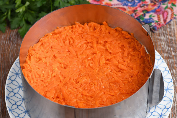 9. Tęsiame salotų surinkimą. Ant kiaušinių dedame stambiai tarkuotą morką ir patepame majonezu.